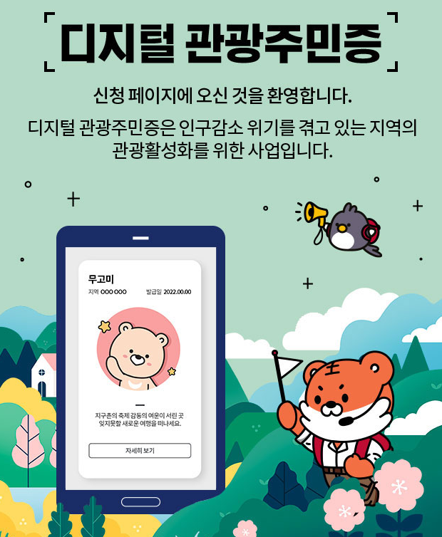 문화체육관광부와 한국관광공사가 함께 합작해서 인구감소 위기를 겪고 있는 지역의 관광 활성화를 목적으로 만들어진 사업입니다. 디지털 관광주민증을 발급받고 할인 혜택 적용 지역에 방문하면 여행 시 체험이나 식음료, 입장권 등 다양한 항목에서 할인 혜택을 챙기실 수 있습니다.